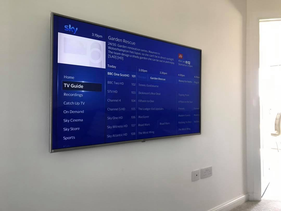 Different installation types: one features a hidden Sky Q box (cables hidden to customer’s cupboard) and the other was fitted using a full motion bracket. But both have the same professional standard.